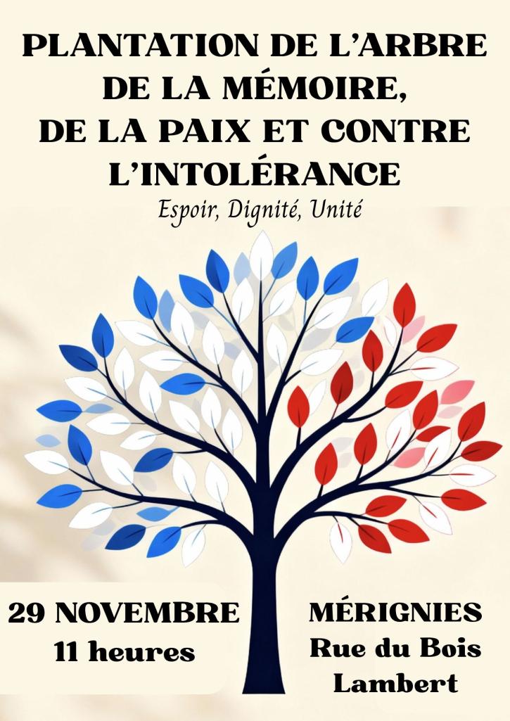 "Rendez-vous le 29 novembre à Mérignies pour planter ensemble l'Arbre de la Mémoire, symbole de paix et d'unité en présence de Jean Moulière, député de la 6° circonscription. Après la cérémonie, partageons le verre de la résilience et de la dignité pour dire oui à l'espoir et non à l'intolérance, et à toutes formes de violences."